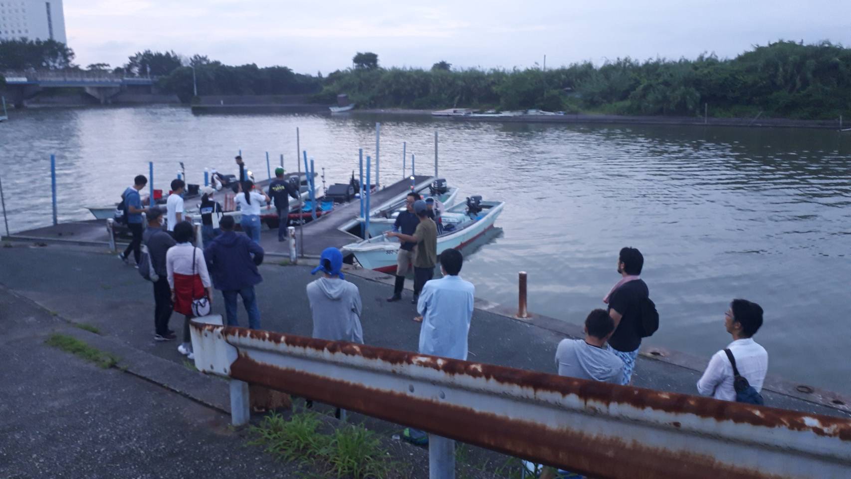 船着き場で船がくるのをみんなで待ち、船が到着したところで乗船します。